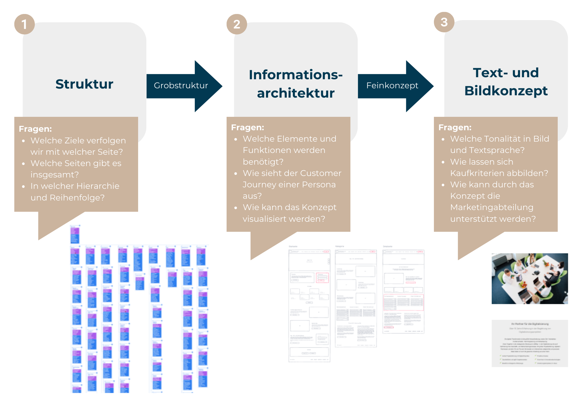 Ein Website-Relaunch ist nicht nur eine technische Aufgabe, sondern vor allem eine inhaltliche Herausforderung. Um eine effektive und benutzerfreundliche Website zu schaffen, muss das Inhaltskonzept sorgfältig geplant werden. In unseren Workshops zur Erstellung eines Inhaltskonzepts bei einem Relaunch bearbeiten wir diese Schlüsselkomponenten: Struktur, Informationsarchitektur sowie Text- und Bildkonzept.