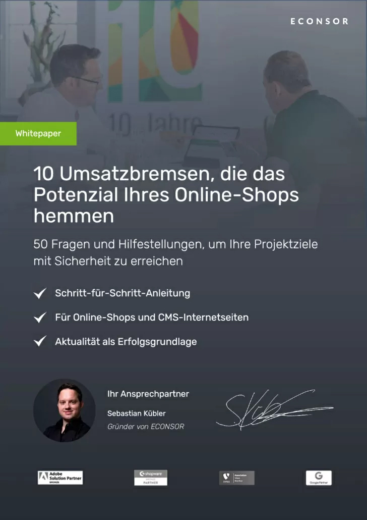 Exklusives Whitepaper mit unverzichtbaren Informationen für E-Commerce-Projekte. Wir erklären Ihnen, wie Sie die 10 häufigsten Umsatzbremsen vermeiden und in Ihren Erfolg umwandeln. Mit unserer umfangreichen Erfahrung aus über 500 Projekten können wir Ihnen konkrete Empfehlungen geben zu: