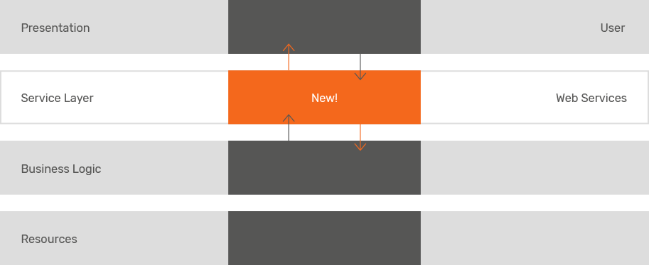 Die Brücke zwischen Front – und Backend schlägt der sogenannte Service Layer. Mithilfe dieser Brücke wird es den Entwicklern möglich individuelle Anforderungen für verschiedene Frontends ganz flexibel mit der Business-Logik zu verknüpfen.