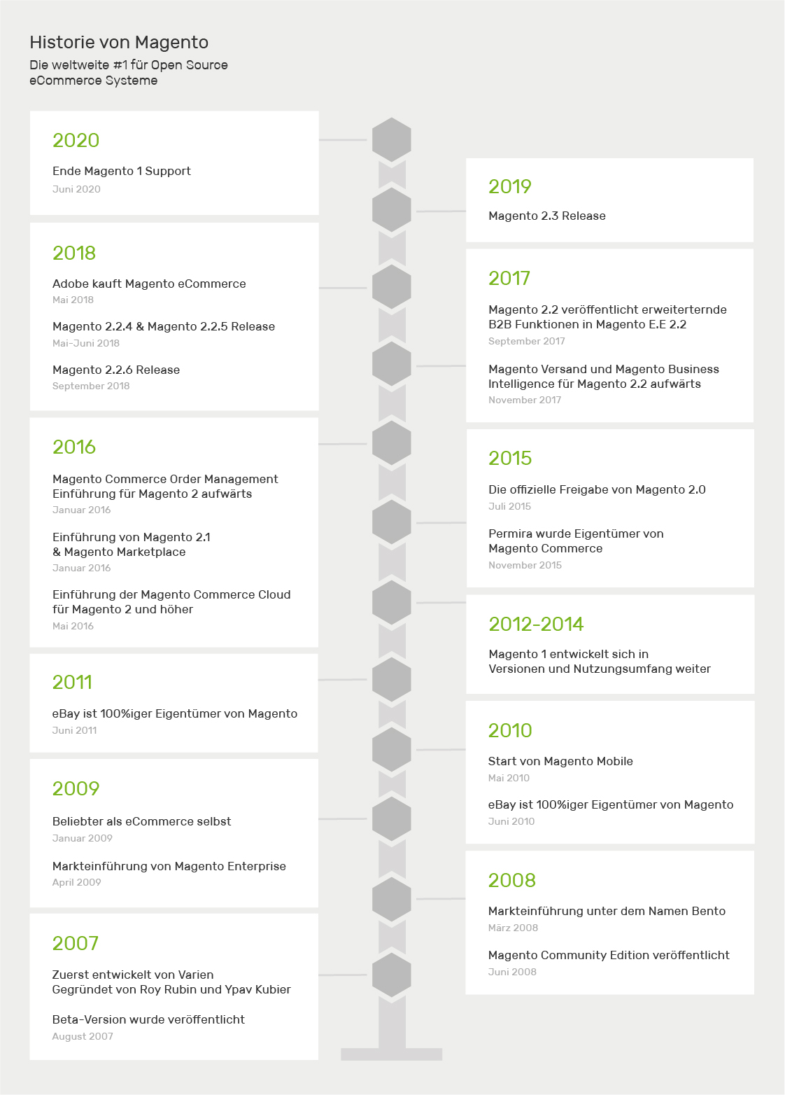 Aufgrund von flexiblen Integrationen und vielfältigen Anpassungsmöglichkeiten ist Magento die weltweit beliebteste Open-Source-Shop-Software. Mit Magento erhalten Sie einen Shopsystem, das alle Kundenanforderungen erfüllt und sofort zahlreiche einsatzbereite Funktionen mitbringt. Doch was wissen Sie über die Geschichte und das Unternehmen hinter Magento? Wir klären Sie auf!