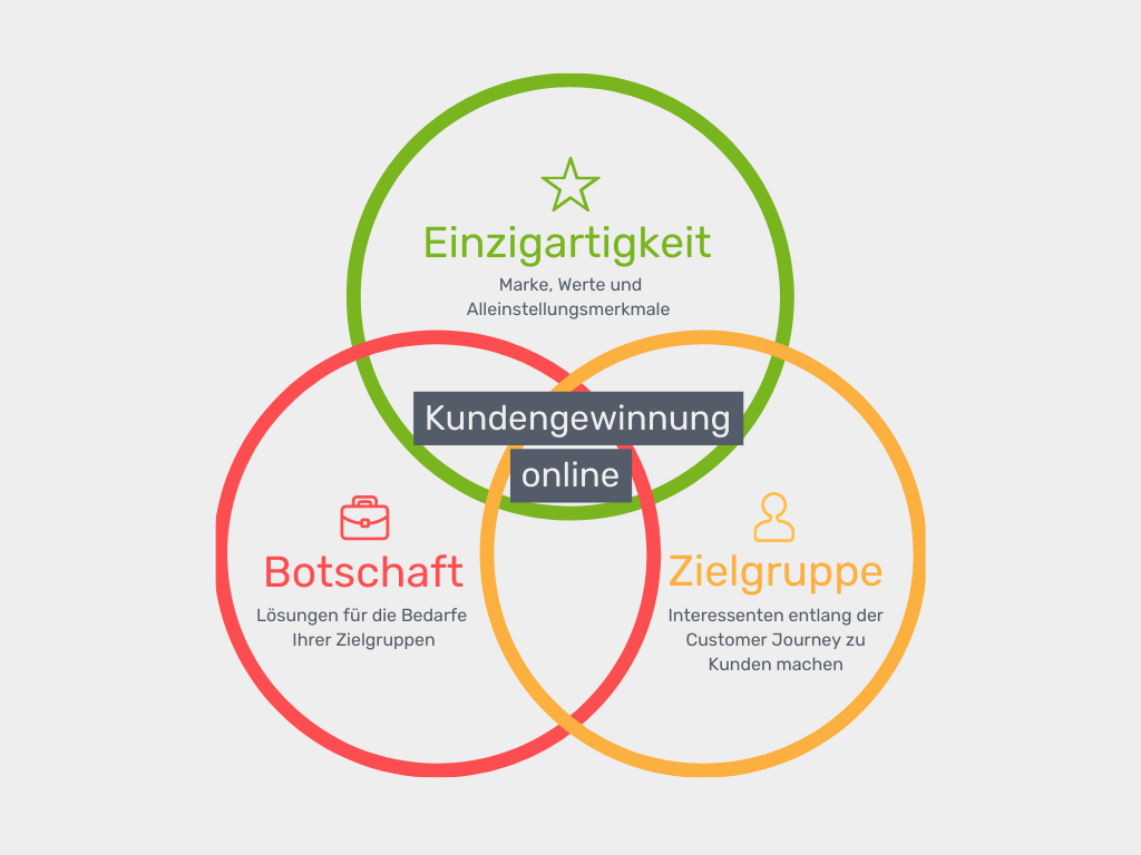 Zielgruppe, Botschaft und Einzigartigkeit bilden die Grundlage für Kundengewinnung online.