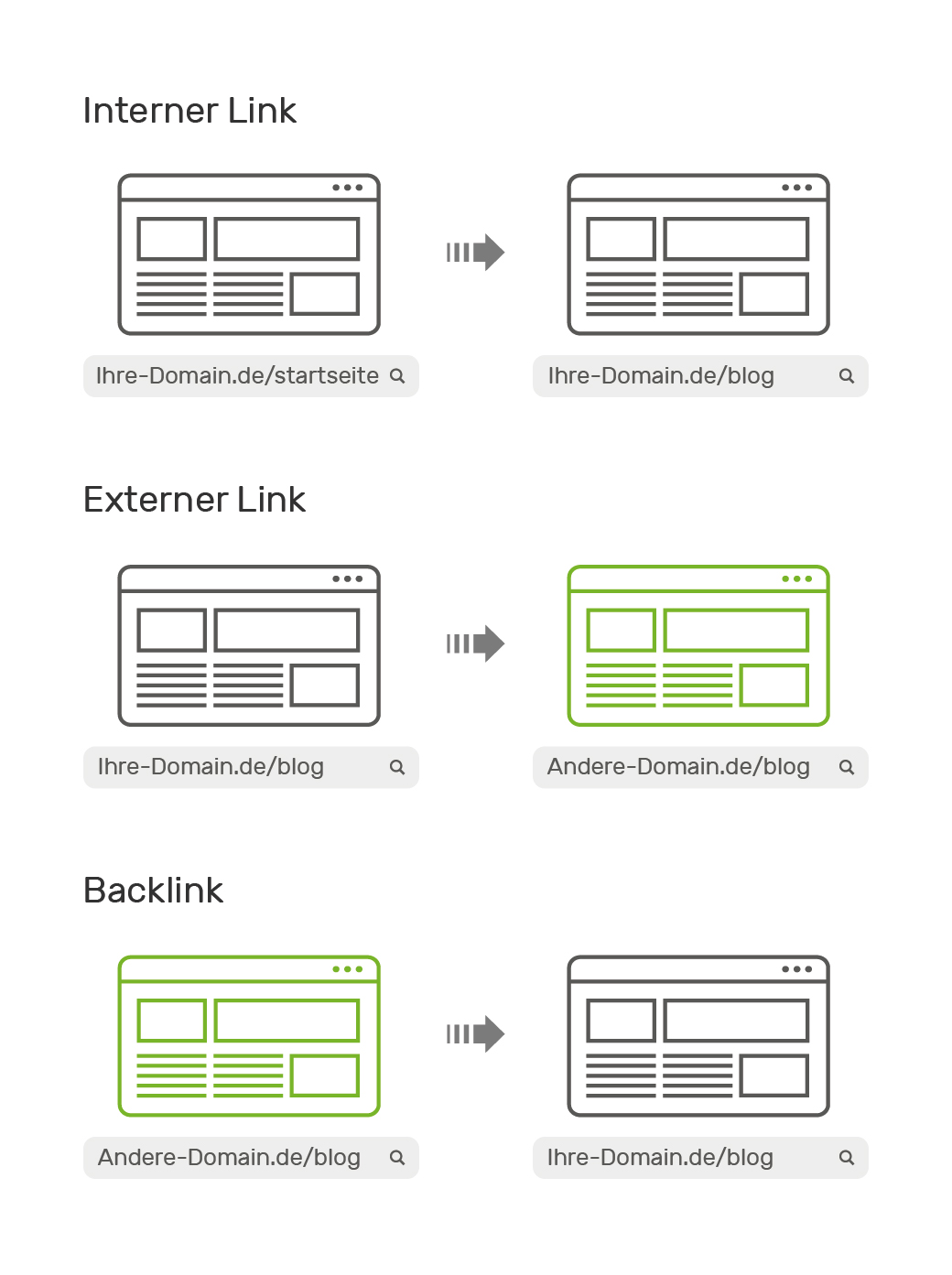 Generell unterscheidet man zwischen internen und externen Links sowie Backlinks.