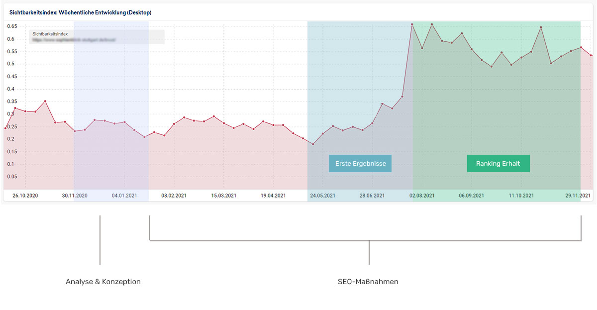 Das Schaubild zeigt die Entwicklung der Sichtbarkeit einer unserer Kunden aus der Medizinbranche auf. Die großen Sprünge in der Sichtbarkeit waren hier nach ca. 7 Monaten zu verzeichnen.