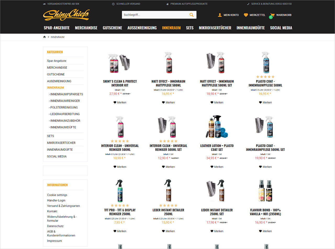 Shiny Chiefs haben sich auf Premium Car Care Produkte für die professionelle Autopflege spezialisiert. Der Online-Shop der Gebrüder Gerdzen aus Haren (Ems) war nicht mehr State-of-the-Art und verlangte dringend nach einem Relaunch. Doch ganz so einfach war es nicht, es galt eine Entscheidung zu treffen: Bei Magento bleiben oder zu Shopware wechseln? Der Kunde baute auf unsere große Erfahrung und Kompetenz im E-Commerce, unsere Schnittstellenkompetenz und nicht zuletzt die innovativen Skills unseres Design-Teams. Das führte zu einer Entscheidung mit beeindruckendem Ergebnis.