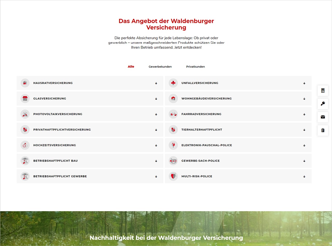 Zahlreiche Kunden vertrauen auf die Waldenburger Versicherung AG, den Top-Versicherer der Würth-Gruppe. Um allen Zielgruppen gerecht zu werden, soll ein Relaunch für die Versicherung einen zeitgemäßen Internetauftritt schaffen. Dabei sollen Angebote für B2B- und B2C-Kunden separat dargestellt werden.