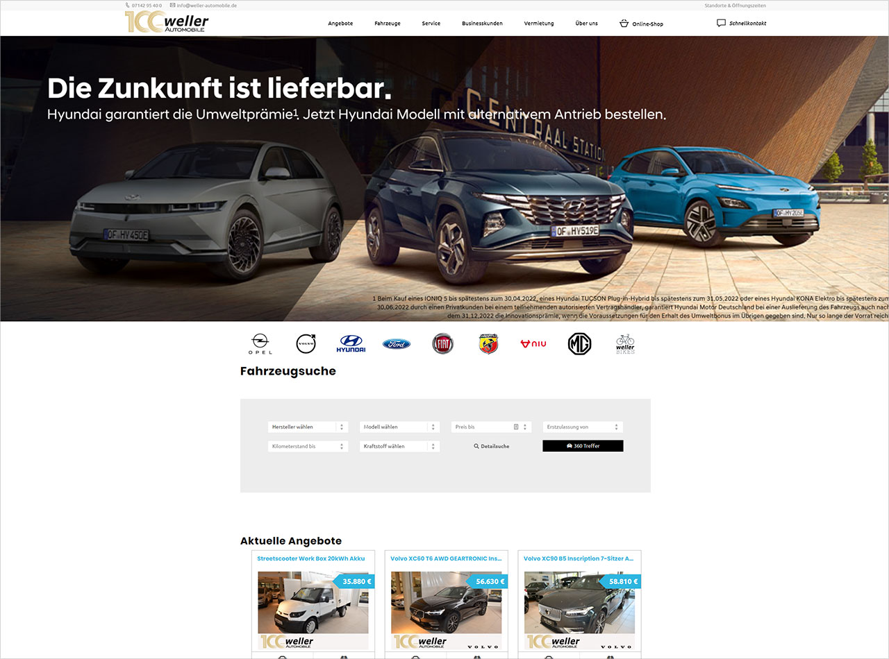 Weller Automobile wurde 1922 vom Großvater der heutigen Geschäftsführer in Bietigheim gegründet. Das Autohaus ist auf Opel, Ford, Hyundai, Toyota und Volvo spezialisiert. Weller Automobile bietet neben Neu- und Gebrauchtwagen auch einen umfassenden Service, Werkstätte, eine Tankstelle und einen Fahrzeugankauf. Weller Automobile ist ein Autohaus mit einer langen Tradition, das trotzdem immer jung geblieben ist.
