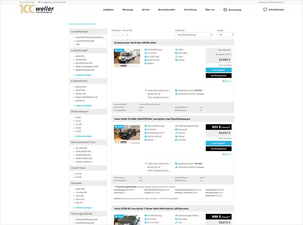 Ergebnisse: Filter in der Fahrzeugsuche, Fahrzeugvermietung, Verschiedene Herstellermarken, Ausführlicher Service, Responsive Webdesign