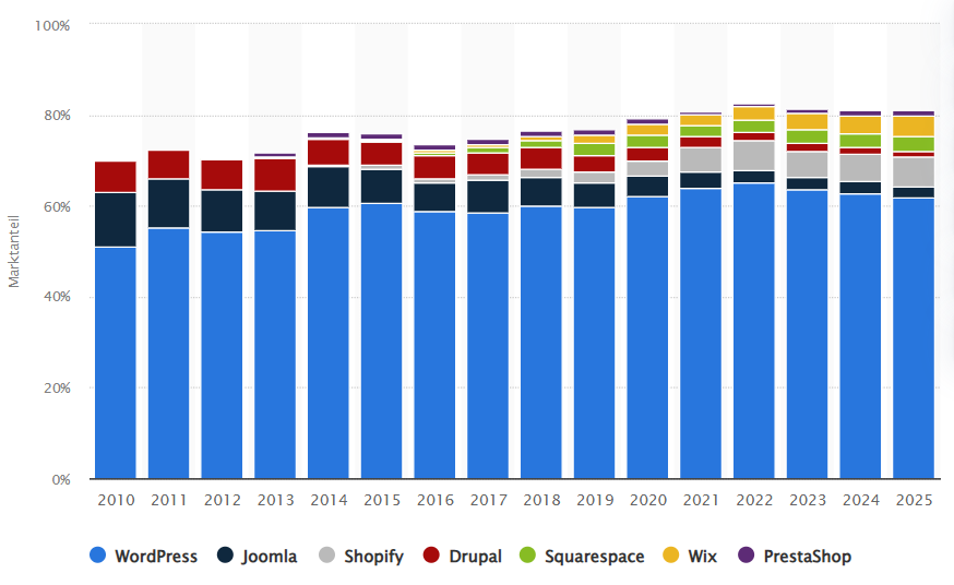 WordPress hat sich über die Jahre hinweg als unangefochtener Marktführer im Bereich der Content-Management-Systeme etabliert. Mit einem Marktanteil von 62 % im Jahr 2024 (Quelle: