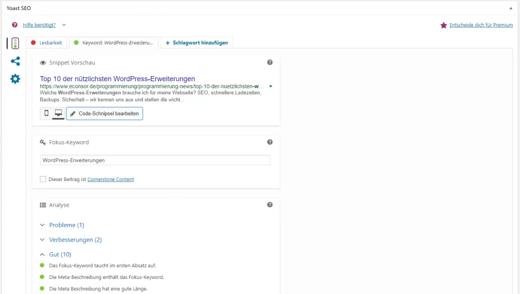 Suchmaschinenoptimierung dürfte inzwischen eines der Hauptziele für den eigenen Webauftritt sein. Dabei müssen stets viele verschiedenen Faktoren beachtet werden. Einen Bereich für Optimierung bildet der Content – im genauen die Texte einer Webseite – ab. Doch wie erkenne ich, ob meine Texte gut auf SEO ausgerichtet sind? An dieser Stelle empfehlen wir die Erweiterung „Yoast SEO“. Wie ein Coach zeigt das Tool im Bearbeitungsmodus der Texte an, welche Maßnahmen noch getroffen werden können, um sowohl die Lesbarkeit als auch die Optimierung für Suchmaschinen zu verbessern. Auch die Vorschau des Beitrags in den Suchergebnissen wird angezeigt und kann bearbeitet werden.