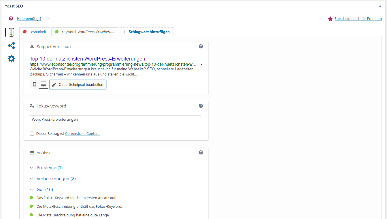 Suchmaschinenoptimierung dürfte inzwischen eines der Hauptziele für den eigenen Webauftritt sein. Dabei müssen stets viele verschiedenen Faktoren beachtet werden. Einen Bereich für Optimierung bildet der Content – im genauen die Texte einer Webseite – ab. Doch wie erkenne ich, ob meine Texte gut auf SEO ausgerichtet sind? An dieser Stelle empfehlen wir die Erweiterung „Yoast SEO“. Wie ein Coach zeigt das Tool im Bearbeitungsmodus der Texte an, welche Maßnahmen noch getroffen werden können, um sowohl die Lesbarkeit als auch die Optimierung für Suchmaschinen zu verbessern. Auch die Vorschau des Beitrags in den Suchergebnissen wird angezeigt und kann bearbeitet werden.